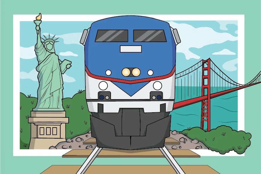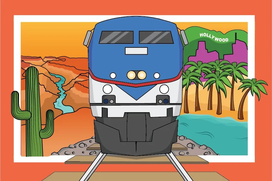 Through further research, I developed a series of three postcards that depict real train routes that travel to various U.S. cities and landmarks.